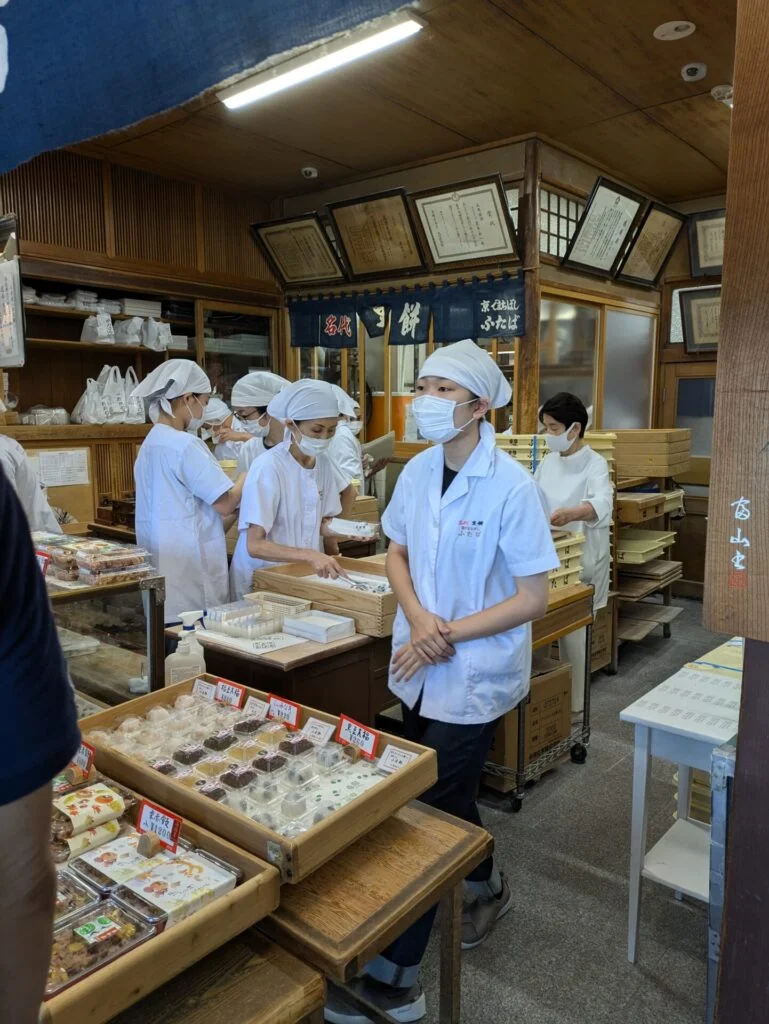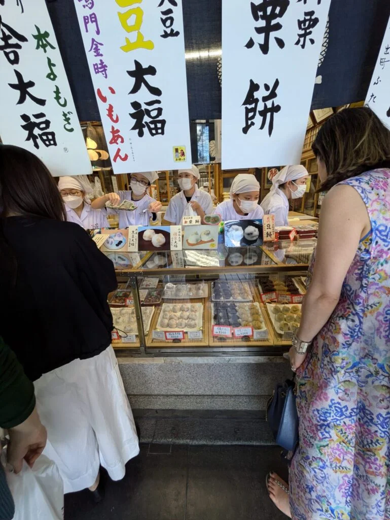 Located in Demachi Shopping Street, about a 5-minute walk from Demachiyanagi Station, Demachi Futaba always has a line of both tourists and locals, buzzing with activity. When you reach the storefront, you’re greeted by a showcase filled with various wagashi. The sight is so enticing that visitors often find themselves wanting to try everything. Seasonal product names hanging from the ceiling further enhance the lively atmosphere.