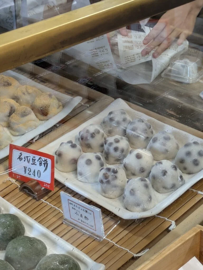 Demachi Futaba’s signature product is their bean daifuku, called “mame mochi.” It’s characterized by its adorable round shape with visible beans. When you bite into it, you experience the soft yet resilient mochi, the smooth anko, and the texture of large beans, creating a perfect harmony of textures.